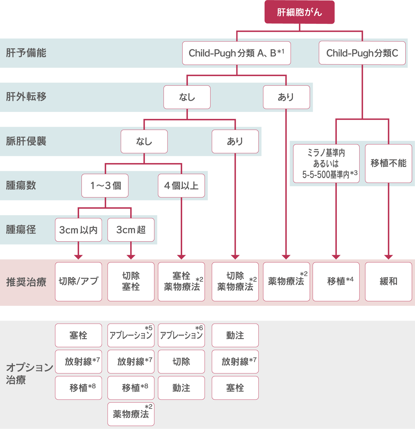 - *3:遠隔転移・脈管侵襲なし、腫瘍径5cm以内かつ腫瘍数5個以内かつAFP500ng/mL 以下