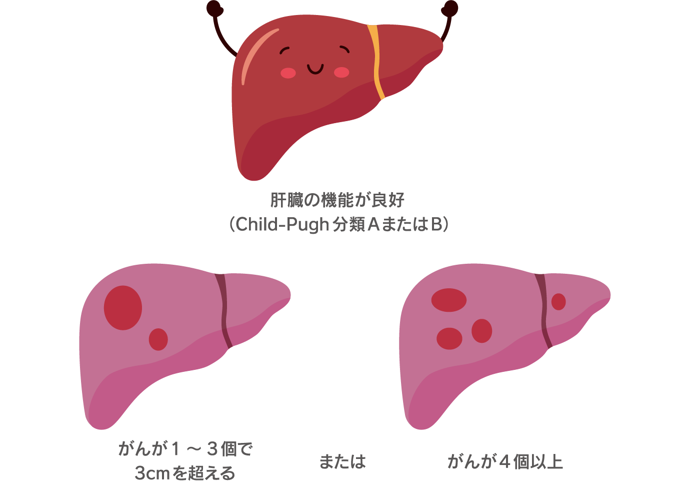 肝切除やラジオ波焼灼療法が受けられない患者さんに実施されるほか、肝機能がよくて他臓器に転移がなく、がんが1~3個で3cmを超える場合、もしくは大きさに関わらず4個以上の場合に選択されることがあります1)。